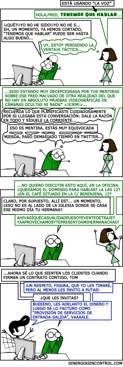 Hacía tiempo que quería dejar clara una característica del personaje de Sarah (que muchos decíais que era demasiado "perfecta"): el tema del control. Siempre he creído que Sarah es un personaje con muchas cosas buenas, pero con sus defectos (como la intransigencia en según qué temas). Pero la saga me ponía a huevo desarrollar y exagerar esta faceta de la saludable paranoia de los sysadmins, que les lleva a, en casos avanzados, anticipar las estupideces que intentarán hacer sus usuarios, o peor: SUS DESARROLLADORES